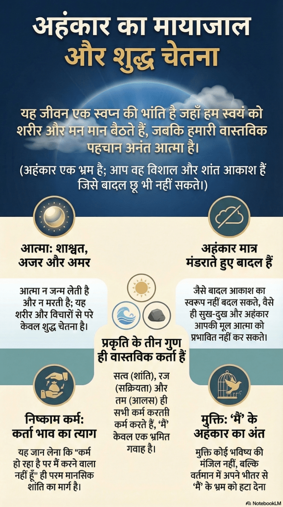 - डर का सामना: जब भी मृत्यु या नुकसान का डर सताए, तो खुद से पूछें—“यह डर किसे लग रहा है?”। आप पाएंगे कि यह डर केवल उस नश्वर ‘पत्ते’ (अहंकार) को है, जबकि आप वह असीम और अमर ‘आकाश’ हैं।